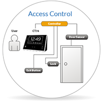 The model CT74 biometric face recognition time clock includes a built-in dry contact relay for optional door access control to admit employees into secure interior locations. You can choose from face recognition only, proximity badge or identification using PIN entry and face recognition combined to identify employees for access into secure environments or for clocking in/out.